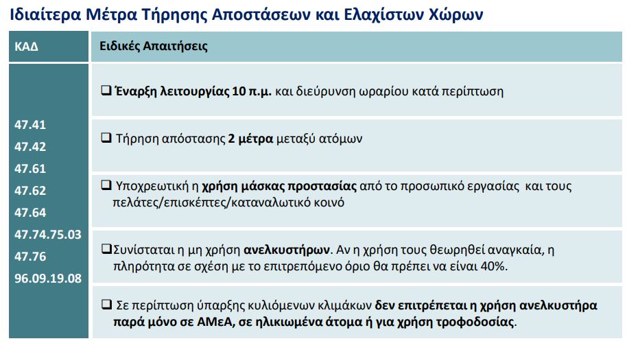 Οι ΚΑΔ που επανεκκινούν είναι οι 4741, 4742, 4761, 4762, 4764, 4776, 7120, 9602.