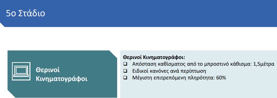 Στο πέμπτο στάδιο που θα προσδιοριστεί τον Ιούνιο και αναλόγως της απόδοσης της στρατηγικής επανόδου στην κανονικότητα, επανεκκινούν τα θερινά σινεμά με 1,5 μέτρο απόσταση μεταξύ των θεατών ανά σειρά και πληρότητα έως 60%.