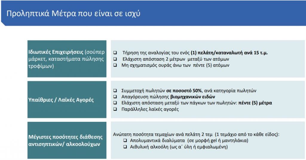 Υποχρεωτική είναι η τήρηση απόστασης 2 μέτρων ανά άτομο, χρήση μάσκας για προσωπικό και πελάτες.