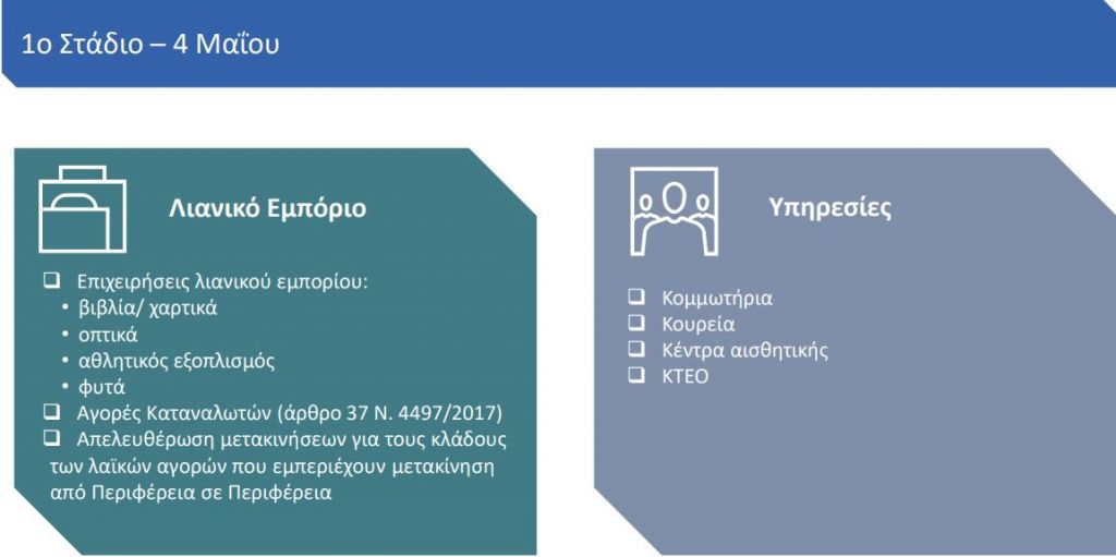 Ειδικότερα, τη Δευτέρα 4 Μαΐου θα «επιστρέψουν» επιχειρήσεις λιανικού εμπορίου χαμηλής όχλησης (βιβλία/χαρτικά, οπτικά, αθλητικός εξοπλισμός, φυτά/λιπάσματα), αγορές καταναλωτών και απελευθερώνεται η μετακίνηση παραγωγών για τις λαϊκές αγορές μεταξύ περιφερειών.