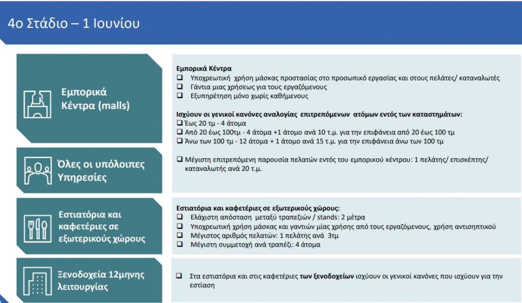 Ανοίγουν τα εμπορικά κέντρα (malls) υπό αυστηρά μέτρα ασφάλειας και χωρίς να επιτρέπεται η παραμονή μέσα σε αυτά για φαγητό ή καφέ. Δηλαδή τα καταστήματα εστίασης μέσα στα εμπορικά κέντρα δεν θα λειτουργούν με καθήμενους.