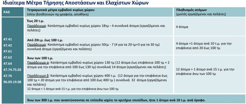 Παράδειγμα: Σε ένα κατάστημα 130 τ.μ επιτρέπονται έως 14 άτομα. Δηλαδή τα 12 άτομα που αφορούν τα 100 τ.μ και επιπλέον 2 άτομα που αφορούν τα υπόλοιπα 30 τ.μ
