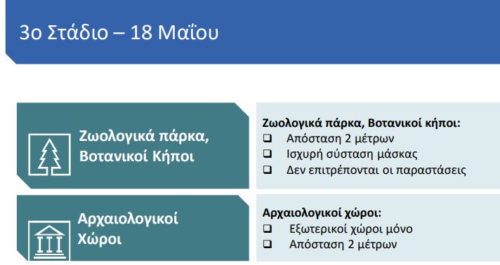 Ανοίγουν αρχαιολογικοί χώροι, ζωολογικά πάρκα και βοτανικοί κήποι, χωρίς να επιτρέπονται παραστάσεις.