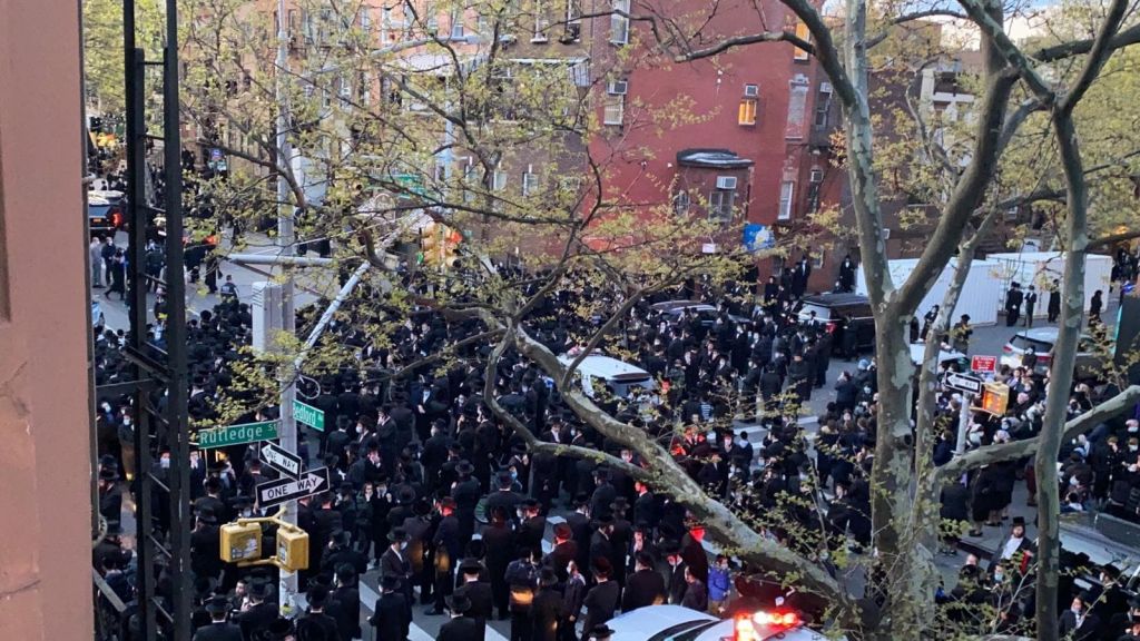 Εκατοντάδες ορθόδοξοι Εβραίοι συγκεντρώθηκαν στους δρόμους κοντά στη συμβολή της Rutledge Street με την Bedford Avenue για να τιμήσουν τον ραβίνο Chaim Mertz, που πέθανε από κοροναϊό, οι περισσότεροι φορώντας μάσκες αλλά χωρίς να αποστάσεις, σύμφωνα με τη New York Post.