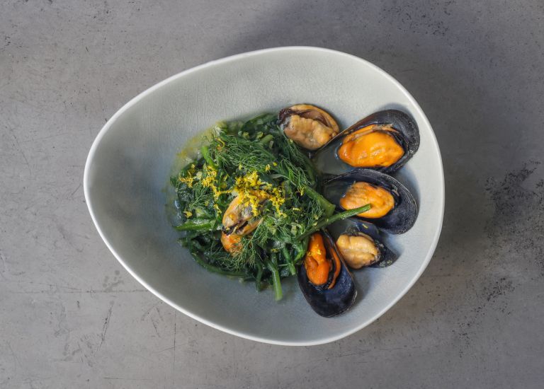 Μύδια φρικασέ με σταμναγκάθι και μάραθο