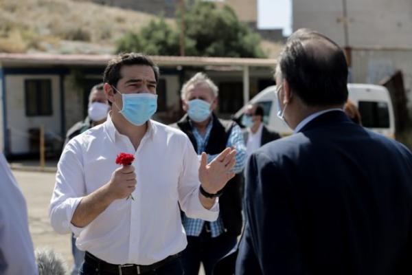 Ο πρόεδρος του ΣΥΡΙΖΑ, τηρώντας τα μέτρα προστασίας φόρεσε την απαραίτητη μάσκα, χαιρετήθηκε με τους εργαζόμενους με τους αγκώνες ενώ λόγω Πρωτομαγιάς κράτησε και το απαραίτητο γαρύφαλλο στο χέρι.