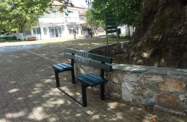 Μάλιστα, οι κάτοικοι του χωριού έγραψαν στην «πλάτη» με μπογιά: «Το παγκάκι του κοροναϊού».