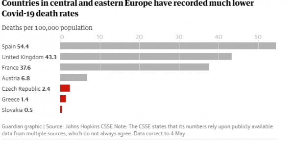 Ακόμη και οι χειρότερο πληγείσες χώρες της κεντρικής και Ανατολικής Ευρώπης έχουν κρούσματα και θανάτους πολύ χαμηλότερα από τα κράτη της Δυτικής Ευρώπης, και σε ορισμένα στατιστικά είναι πραγματικά αξιοσημείωτες: η Σλοβακία κατέγραψε μόλις 1.413 επιβεβαιωμένα κρούσματα και 25 θανάτους. Η γειτονική Αυστρία, που θεωρείται ευρέως ότι αντιμετώπισε με επιτυχία την πρόκληση του κορωνοϊού, έχει ωστόσο πάνω από 10 φορές τον αριθμό των λοιμώξεων και 20 φορές περισσότερους θανάτους από την Σλοβακία, με πληθυσμό μικρότερα από το διπλάσιο του μεγέθους.