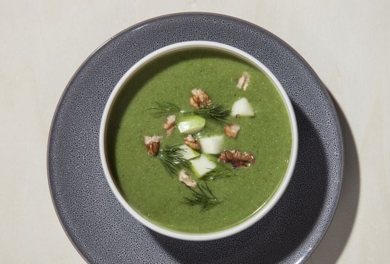 Η γλύκα του αρακά κάνει ωραία αντίθεση με την οξύτητα του ξινόγαλου ενώ τα καρύδια και το μήλο προσθέτουν ένταση και τραγανή υφή.