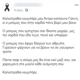 Λίγες ώρες μετά την είδηση του θανάτου του Γιάννη Κατσούνα ο κουμπάρος του ανήρτησε στα social media μία σπαρακτική μαντινάδα αποχωρισμού.