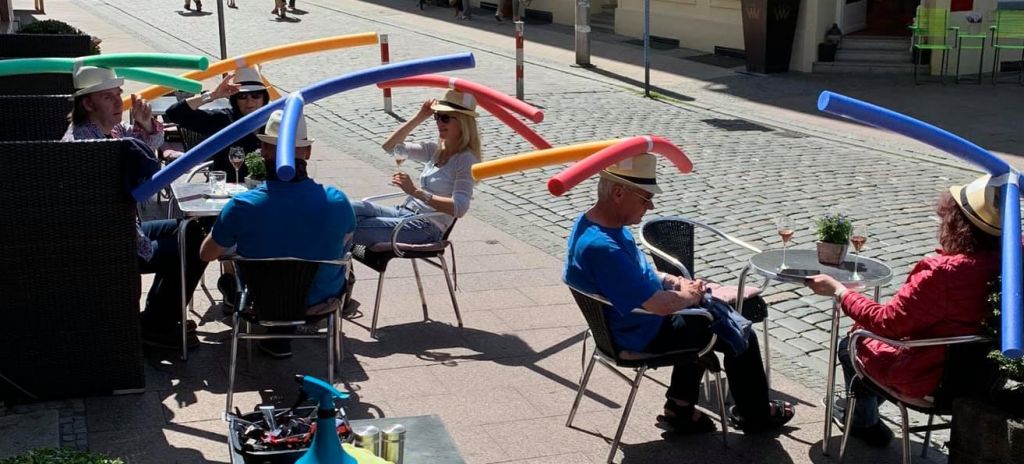 Το καφέ την πόλη Σβέριν της Βόρειας Γερμανίας προσφέρει καπέλα στους πελάτες του στα οποία έχουν τοποθετηθεί ειδικά σωσίβια για πισίνες προκειμένου να διατηρηθεί η απόσταση ασφαλείας μεταξύ των θαμώνων.