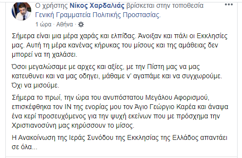 «Σήμερα είναι μια μέρα χαράς και ελπίδας. Άνοιξαν και πάλι οι Εκκλησίες μας. Αυτή τη μέρα κανένας κήρυκας του μίσους και της αμάθειας δεν μπορεί να τη χαλάσει», απάντησε, μεταξύ άλλων ο Νίκος Χαρδαλιάς.
