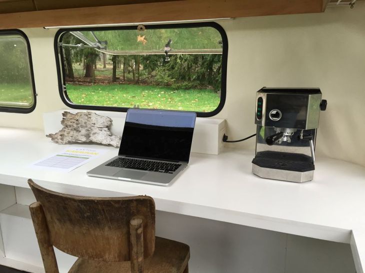 Όπως μου εξηγεί ο ίδιος, το Kantoor Karavaan, δηλαδή, το κινητό του γραφείο, δεν είναι τίποτε άλλο από ένα ειδικά διαμορφωμένο παλιό τροχόσπιτο το οποίο προσφέρει όλες τις ευκολίες ενός μοντέρνου εργασιακού χώρου. Είναι πλήρως εξοπλισμένο με κουζίνα, κρεβάτι και χημική τουαλέτα, διαθέτει ασύρματο wi-fi και τροφοδοτείται ενεργειακά από ηλιακά πάνελ. Ο ενδιαφερόμενος, πληρώνοντας ένα ποσό, μπορεί απλά να φέρει τον υπολογιστή του και να εργαστεί μέσα στο φυσικό περιβάλλον που επιλέγει, μόνος του ή συνεργατικά, καθώς το τροχόσπιτο προσφέρεται και για co-working.