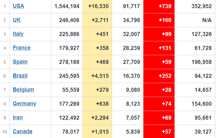 Σε σύγκριση με την προηγούμενη καταμέτρηση, πριν από ακριβώς 24 ώρες, 2.719 νέοι θάνατοι και 77.737 νέα κρούσματα καταγράφηκαν παγκοσμίως. Οι χώρες που ανακοίνωσαν τους περισσότερους θανάτους είναι οι ΗΠΑ με 667 νέους θανάτους, η Βραζιλία (485) και η Βρετανία (160).