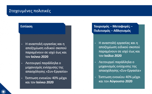 - Επεκτείνεται, για ακόμη μεγαλύτερο χρονικό διάστημα, το δικαίωμα αναστολής σύμβασης εργασίας των εργαζομένων, η αποζημίωση ειδικού σκοπού και η κάλυψη ασφαλιστικών εισφορών τους. Συνεχίζεται η δυνατότητα αναστολής σύμβασης εργασίας, σε ποσοστό μάλιστα έως 100%, των εργαζομένων στους κλάδους του τουρισμού, της εστίασης, των μεταφορών, του πολιτισμού και του αθλητισμού.