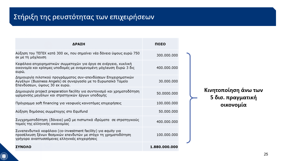 Το συνολικό κόστος των μέτρων που βρίσκονται σε εφαρμογή ή θα υλοποιηθούν διευρύνεται στα περίπου 14,5 δισ. ευρώ, και η προστιθέμενη αξία τους στα 20 δισ. ευρώ.