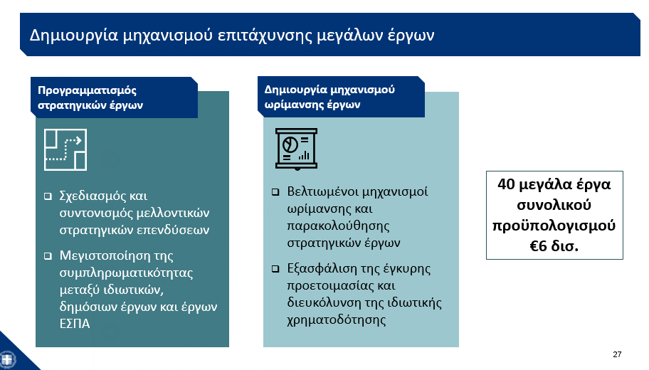 Το υπουργείο θέτει άμεσα 40 μεγάλα έργα ύψους 6 δισ. ευρώ. Αναμένεται η εξειδίκευση των μέτρων.