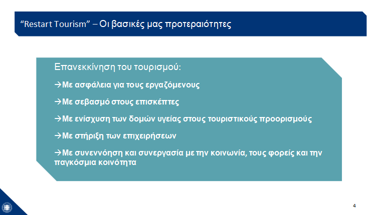 Ο κ. Θεοχάρης αναφέρθηκε στο «Restart Tourism», ένα συνεκτικό σχέδιο επανεκκίνησης του τουρισμού, με ασφάλεια των εργαζομένων, σεβασμό στους επισκέπτες, στήριξη επιχειρήσεων και εργαζομένων.
