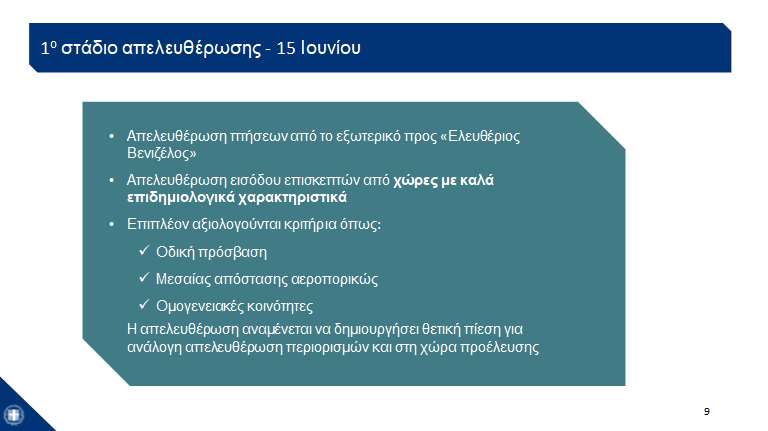 Όπως είπε o υπουργός, θα καθοριστεί η λίστα των χωρών και εξήγησε ότι «απελευθέρωση» σημαίνει είσοδος χωρίς τεστ και χωρίς καραντίνα, αλλά θα υπάρχει δικαίωμα για δειγματοληπτικά τεστ.