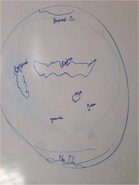 Ποια Αμερική, ποια Ρωσία, ποια Αυστραλία, ποια Αφρική ! Η Κρήτη μας. Η Κρήτη της μεγάλης και αδίδακτης ιστορίας. Αυτή είναι το κέντρο του κόσμου, το κέντρο της μαθήτριας της Στ΄ τάξης του Δημοτικού Σχολείου Θραψανού που ζωγράφισε την υδρόγειο σφαίρα και τοποθέτησε την Κρήτη μετά από το μάθημα «Η Μάχη της Κρήτης».