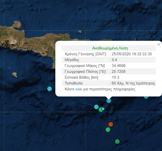 Η δόνηση είχε εστιακό βάθος 10,3 χλμ και επίκεντρο που εντοπίζεται στα 60 χλμ νότια της Ιεράπετρας.