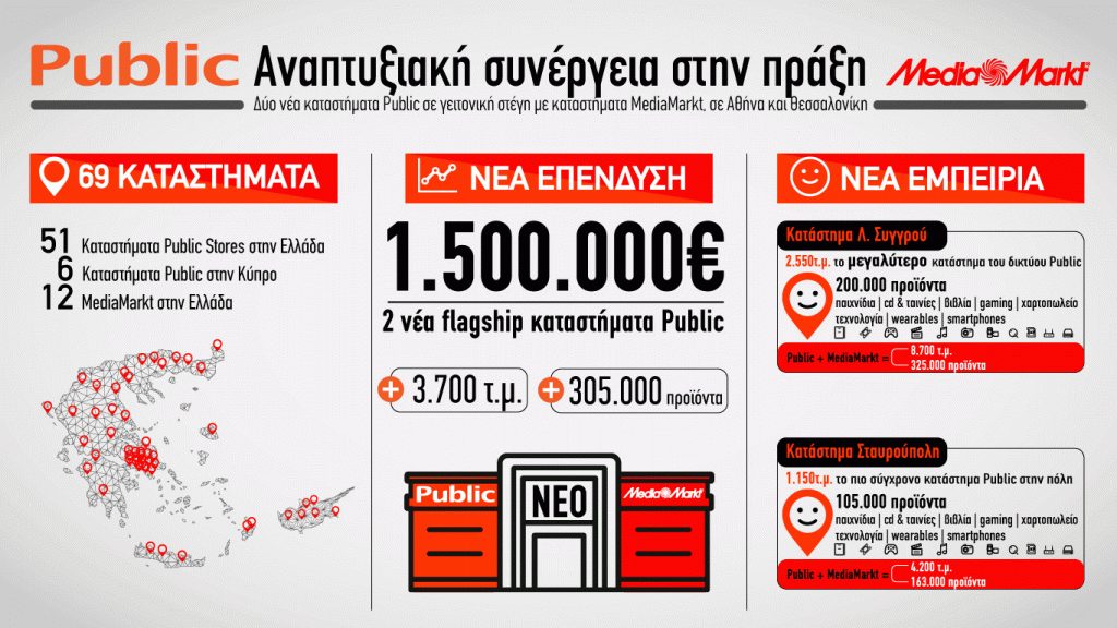 Κίνηση-ορόσημο για την αναπτυξιακή πορεία της Public-MediaMarkt, είναι το άνοιγμα δύο νέων flagship καταστημάτων Public σε κτηριακές εγκαταστάσεις που ήδη φιλοξενούν καταστήματα MediaMarkt στην Αθήνα και στη Σταυρούπολη Θεσσαλονίκης. Η προσθήκη των δύο καταστημάτων ενισχύει την γεωγραφική διασπορά του δικτύου της εταιρείας Public-MediaMarkt, που αριθμεί πλέον 69 καταστήματα σε όλη την Ελλάδα.
