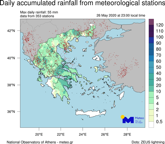 Περισσότεροι από 1.600 κεραυνοί καταγράφηκαν από το σύστημα ανίχνευσης κεραυνών «ΖΕΥΣ» του Εθνικού Αστεροσκοπείου Αθηνών την Τρίτη .