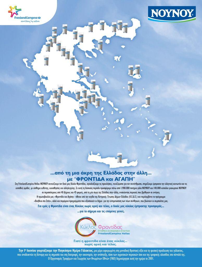 Κατά τη διάρκεια της πανδημίας, η FrieslandCampina Hellas – ΝΟΥΝΟΥ, μέσα από σειρά δράσεων και ενεργειών, έχει προσφέρει συνολικά με «Φροντίδα και Αγάπη» πάνω από 1.900.000 ποτήρια γάλα ΝOYNOY και 140.000 κύπελλα γιαουρτιού ΝΟΥΝΟΥ ενισχύοντας περισσότερους από 40 δήμους και 45 Φορείς σε όλη τη χώρα. Ειδικότερα, έχει συνεργαστεί με τους 10 μεγαλύτερους Δήμους, όπως Αθηνών, Θεσσαλονίκης, Πειραιά, Ηρακλείου, Λαρισαίων, Βόλου, Περιστερίου, Ρόδου, Ιωαννίνων, Πύργου στηρίζοντας περίπου 44.000 συνανθρώπους μας. Ταυτόχρονα, στις πρωτοβουλίες προσφοράς της εταιρείας εντάσσονται περιοχές που τέθηκαν σε απομόνωση λόγω της πανδημίας, όπως η Δαμασκηνιά και Δραγασιά του Δήμου Βοΐου, Εχίνος του Δήμου Μύκης, Μεσοποταμία του Δήμου Καστοριάς, Φούστανη Αλμωπίας στην Πέλλα, καθώς και άλλες περιοχές που αντιμετωπίζουν σοβαρά προβλήματα όπως οι Δήμοι Ξάνθης, Καστοριάς, Κοζάνης, Χαλκίδας, Κομοτηνής, Ερμιονίδας, Μυτιλήνης, Ζακύνθου, οι οποίοι βοηθούν συνολικά πάνω από 9.000 ωφελούμενους.