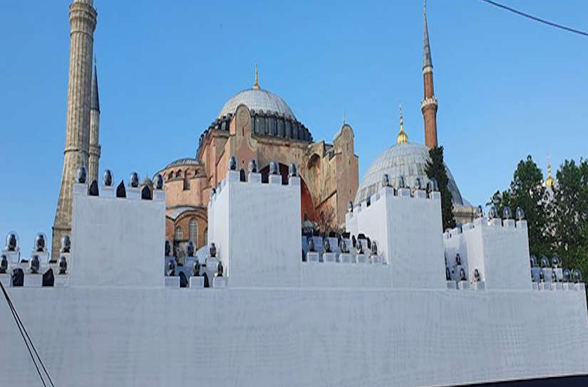 Η κρατική τηλεόραση της Τουρκίας (ΤRT) έστησε ένα ομοίωμα τείχους ακριβώς έξω από το χώρο του Μουσείου της Αγίας Σοφίας και το βράδυ αναμένεται να γίνει ένα τηλεοπτικό show αναπαράστασης της 29ης Μαΐου του 1453.