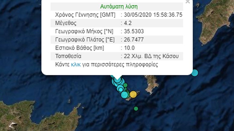 Το εστιακό βάθος του σεισμού είναι 10 χιλιόμετρα, ενώ το επίκεντρό του εντοπίζεται 22 χιλιόμετρα βορειοδυτικά της Κάσου.