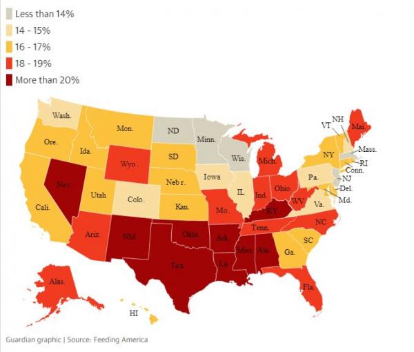 Συνολικά, περίπου 54 εκατομμύρια άνθρωποι στις ΗΠΑ θα μπορούσαν να πεινάσουν, αν δε λάβουν βοήθεια, σύμφωνα με ανάλυση της Feeding America, του εθνικού δικτύου τραπεζών τροφίμων.