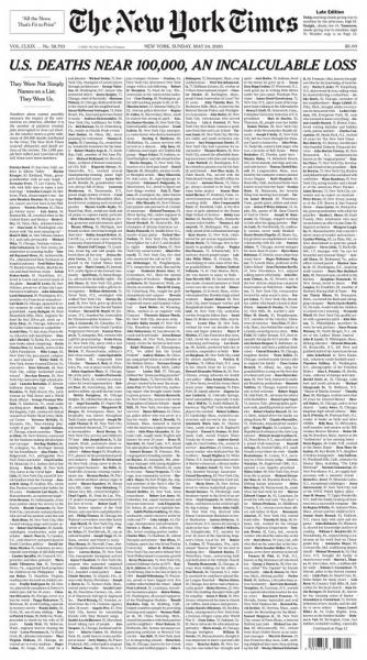 Χωρίς πηχυαίο τίτλο κάποια φωτογραφία, οι αρχισυντάκτες της αμερικανικής εφημερίδας γέμισαν την πρώτη σελίδα με τα ονόματα 1.000 ανθρώπων που έπεσαν θύματα του κοροναϊού στις ΗΠΑ.