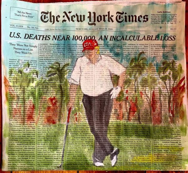 Καλλιτέχνες ζωγράφισαν τον Ντόναλντ Τραμπ να παίζει γκολφ κάτω από τον τίτλο πρωτοσέλιδου των New York Times με τα θύματα του ιού