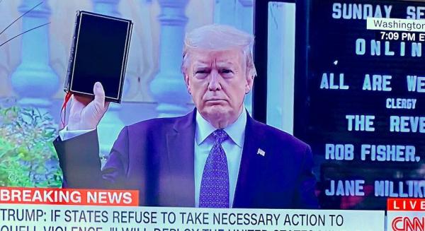 Μετά το «σόου» όπου έδωσε πηγαίνοντας στο καταφύγιο με την οικογένεια του, ξαφνικά ξεμύτισε, στήθηκε μπροστά στις κάμερες με το Ευαγγέλιο και προσευχήθηκε για την εκκλησία που καταστράφηκε μερικώς από την πυρκαγιά προχθές κατά την διάρκεια των διαδηλώσεων.