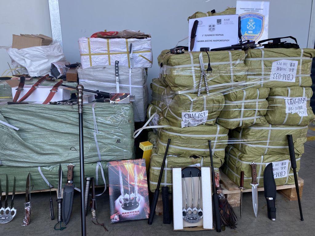 Οι ελεγκτές τού Τελωνείου σε συνεργασία με στελέχη του Λιμενικού βρήκαν επιμελώς κρυμμένα στο βάθος του κοντέινερ 4.927 μαχαίρια, ξιφίδια, συσκευές ηλεκτρικής εκκένωσης, πτυσσόμενες αστυνομικές ράβδους και σιδερογροθιές με λάμες