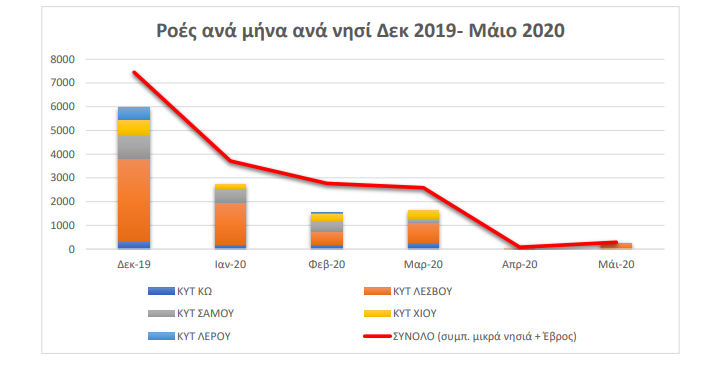 Μείωση των ροών κατά 91% καταγράφηκε τον Μάιο σε σχέση με το αντίστοιχο διάστημα πέρυσι, σύμφωνα με τα μηνιαία στοιχεία του υπουργείου Μετανάστευσης και Ασύλου, ενώ σε 4 νησιά ( Χίος, Σάμος, Λέρος, Κως) δεν υπήρξε καμία άφιξη.