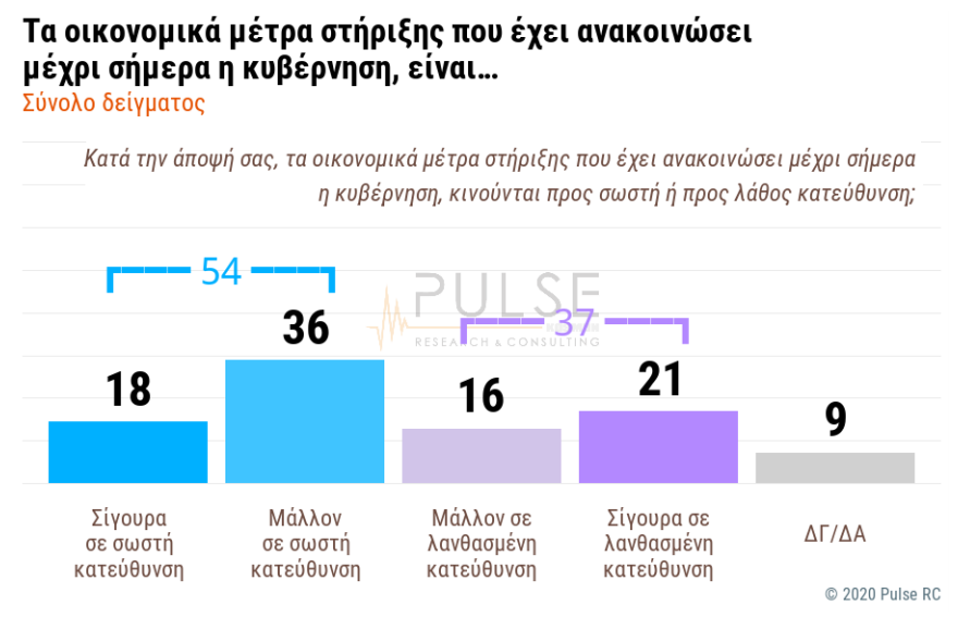 Επιπρόσθετα, το 54% εκτιμά πως τα μέτρα στήριξης της οικονομίας είναι σε θετική κατεύθυνση, ενώ το 37% απαντά πως κινούνται σε αρνητική κατεύθυνση.