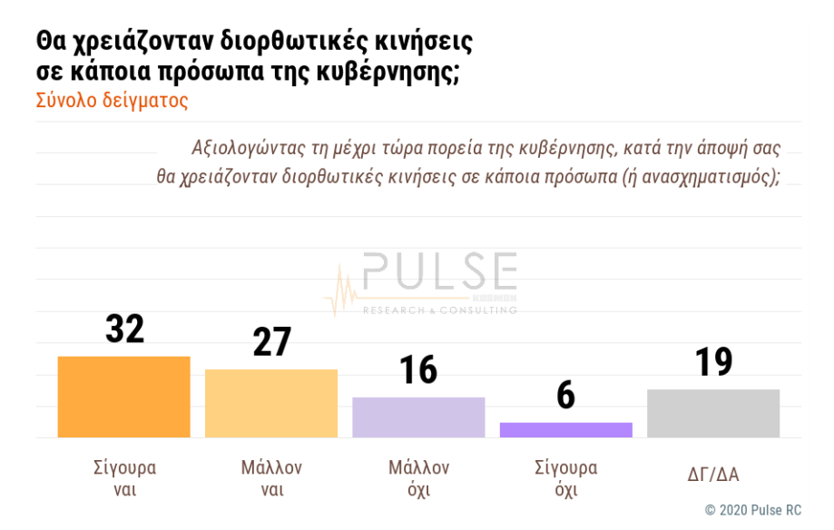 Επίσης, το 59% απαντά πως χρειάζονται διορθωτικές κινήσεις σε κάποια πρόσωπα της κυβέρνησης, ενώ το 22% απαντά πως πρέπει να μείνει το κυβερνητικό σχήμα ως έχει.