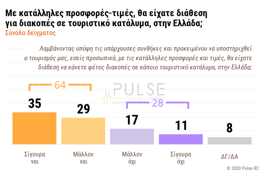 Το 64% απαντά πως με τις κατάλληλες τιμές θα έκανε διακοπές σε τουριστικό κατάλυμα στην Ελλάδα, ενώ το 28% απαντά πως δεν θα έκανε διακοπές.