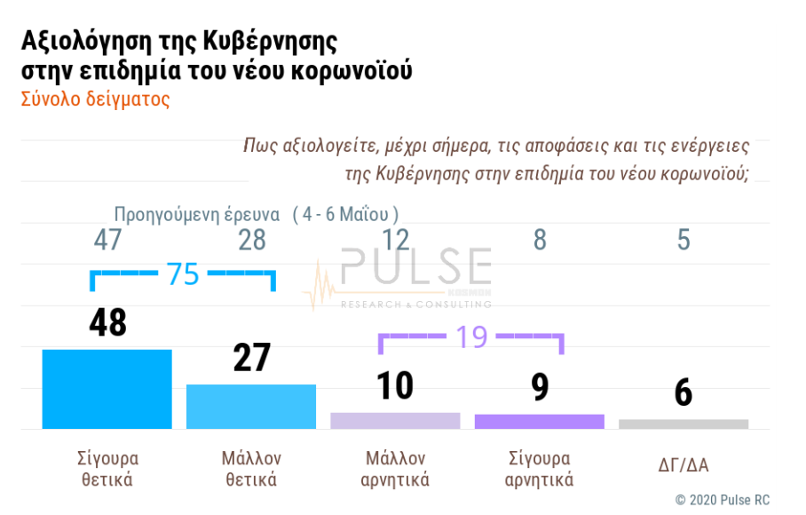 Το 75% αξιολογεί θετικά τις επιδόσεις της κυβέρνησης στη διαχείριση της πανδημίας του κοροναϊού, ενώ το 19% αρνητικά.