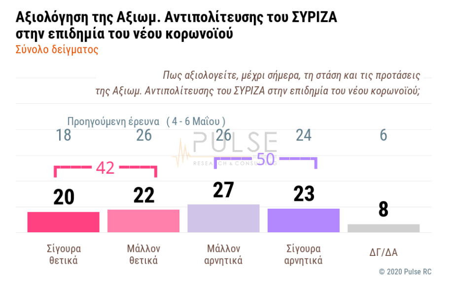Αντίστοιχα, το 42% αξιολογεί θετικά τη στάση του ΣΥΡΙΖΑ έναντι της κυβέρνησης κατά τη διάρκεια της πανδημίας, ενώ το 50% αρνητικά.