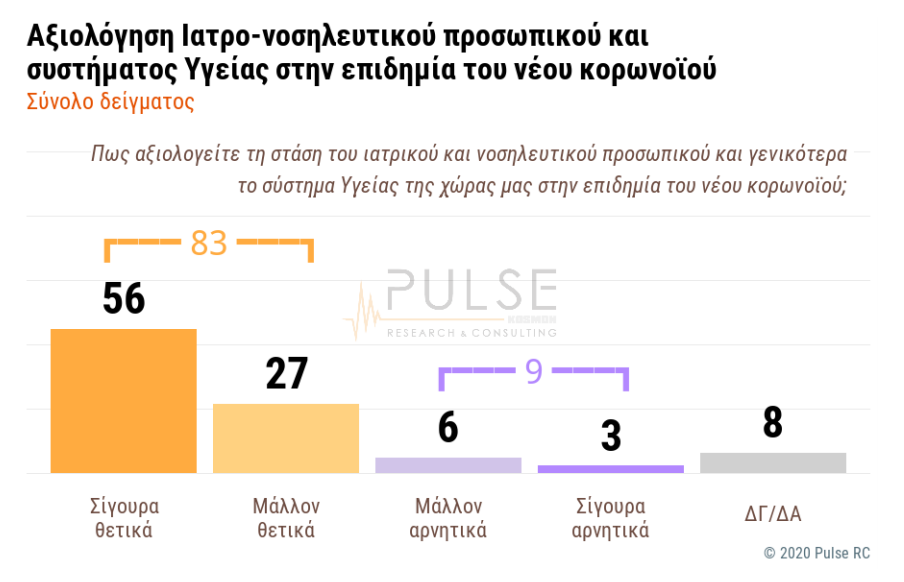 Το 83% αξιολογεί θετικά την αντίδραση των γιατρών – νοσηλευτών και συνολικά του ΕΣΥ απέναντι στην πανδημία, ενώ μόλις το 9% δίνει αρνητική αξιολόγηση.