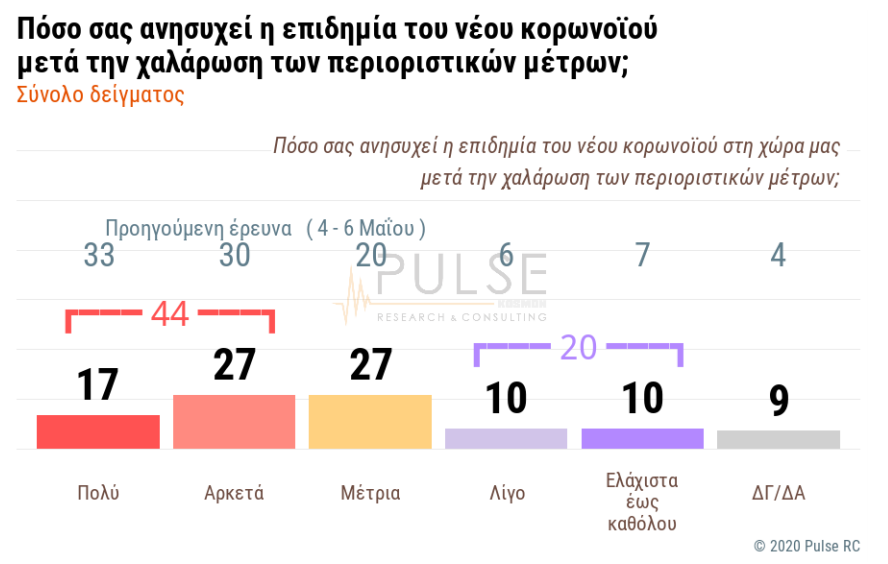 Την ίδια στιγμή, το 44% ανησυχεί για την επιδημία μετά τη χαλάρωση των μέτρων, ενώ το 20% δεν ανησυχεί. Το 27% ανησυχεί σε μέτριο βαθμό.