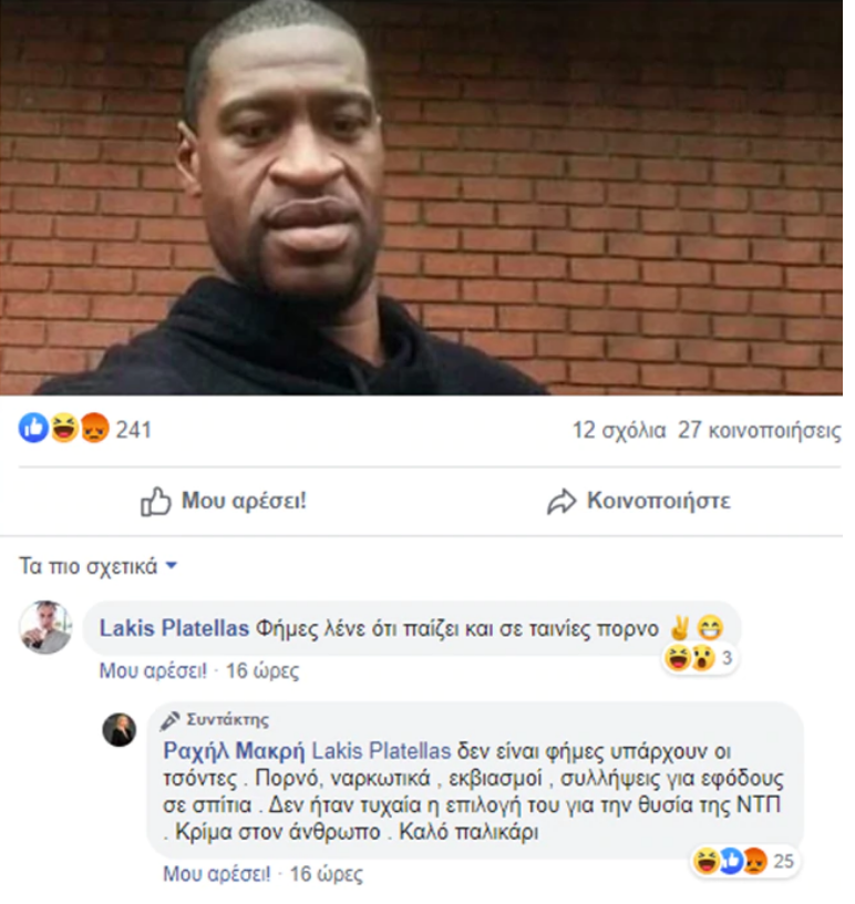 Ξαναχτύπησε με αφορμή τη δολοφονία του Αφροαμερικανού Τζορτζ Φλόιντ από αστυνομικό η Ραχήλ Μακρή.