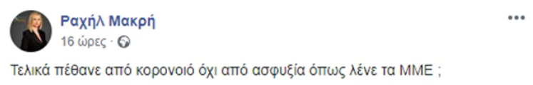 «Τελικά πέθανε από κορονοιό όχι από ασφυξία όπως λένε τα ΜΜΕ;» θα αναρωτηθεί μεταξύ άλλων η πρώην βουλευτής.