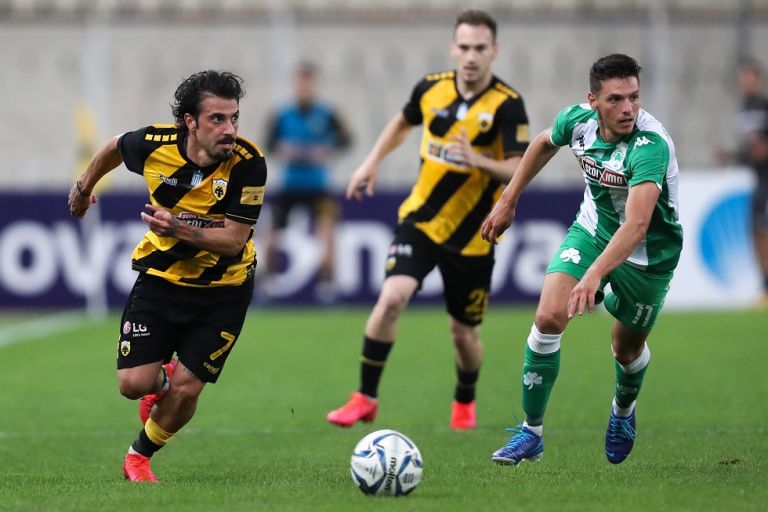Στιγμές έντασης μεταξύ των δύο παικτών της ΑΕΚ κατά την διακοπή του πρώτου ημιχρόνου, με τον Ιταλό να πιάνει από το λαιμό τον Βόσνιο κεντρικό αμυντικό.