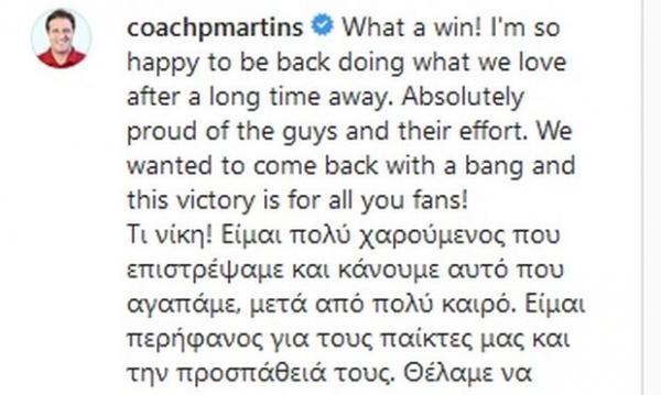 Ο Μαρτίνς με ανάρτησή του στα social media δήλωσε υπερήφανος για τους ποδοσφαιριστές του, εξέφρασε τη χαρά του για την επιστροφή στη δράση και αφιέρωσε τη μεγαλειώδη νίκη επί του ΠΑΟΚ στους οπαδούς του Ολυμπιακού!