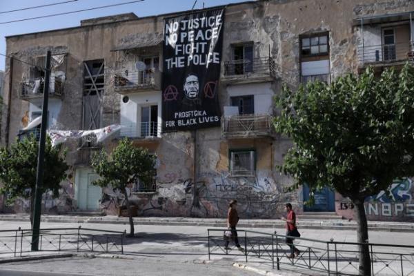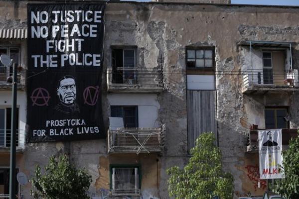 Ενα τεράστιο πανό εις μνήμην του Τζορτζ Φλόιντ, του αφροαμερικανού που δολοφονήθηκε από αστυνομικό στη Μινεάπολη των ΗΠΑ, κοσμεί τα προσφυγικά στη Λεωφόρο Αλεξάνδρας.