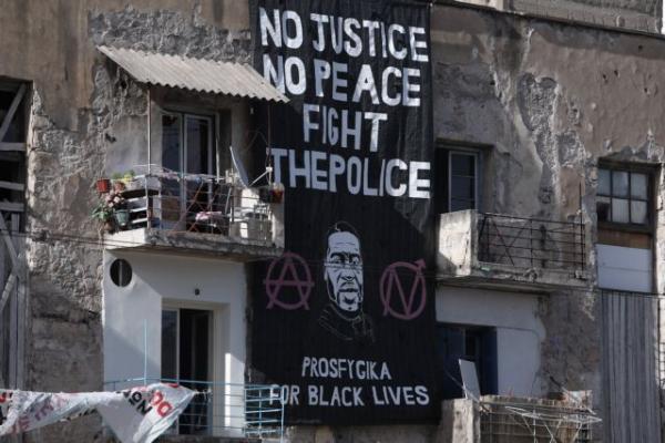 «No justice, no peace, fight the police» («Χωρίς δικαιοσύνη δεν μπορεί να υπάρξει ειρήνη, πολεμήστε την αστυνομία») γράφει το πανό.