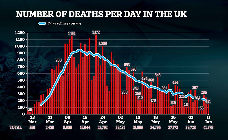 Ο αριθμός των θανάτων που καταγράφηκε την τελευταία μέρα σε όλους τους χώρους στη Βρετανία είναι 151, και ο συνολικός αριθμός των θανάτων έφτασε τους 41.128, σύμφωνα με τα δεδομένα του υπουργείου Υγείας για την πανδημία. Τα νέα επιβεβαιωμένα κρούσματα που καταγράφηκαν χθες ήταν 1.266.